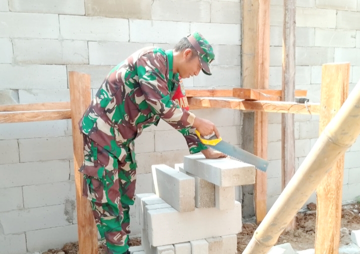 Serka Agus Joko, Babinsa Desa Bulakan, melaksanakan kegiatan karya bakti membantu pemasangan pondasi rumah salah satu warga di wilayah Kecamatan Cinangka.