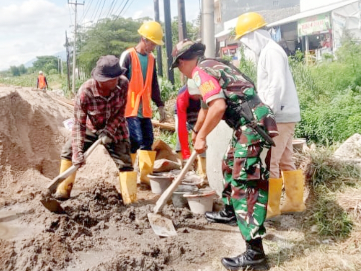 Serda Ahmad, Babinsa Desa Kosambironyok, yang bersama warga melaksanakan pembangunan pondasi pembatas badan jalan di Kampung Kamurang, Desa Kosambironyok.