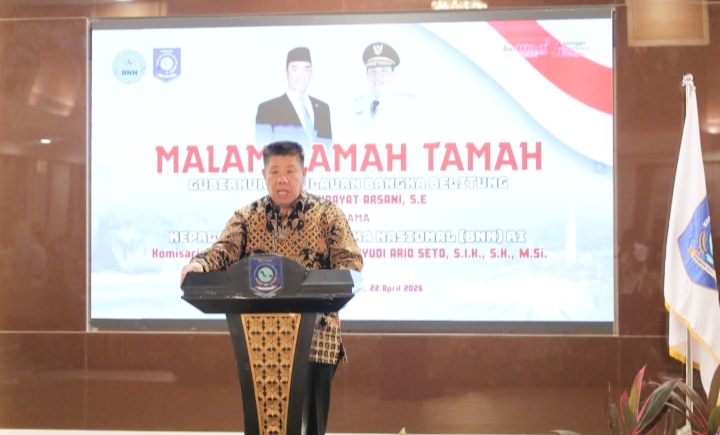 SEKILASINDONEWS .COM— Gubernur Kepulauan Bangka Belitung, Hidayat Arsani, menegaskan pentingnya sinergi pusat dan daerah dalam pemberantasan narkoba saat menghadiri malam ramah tamah bersama Kepala Badan Narkotika Nasional (BNN) RI, Komjen Pol Suyudi Ario Seto, di Gedung Mahligai Rumah Dinas Gubernur Babel, Pangkalpinang, Rabu (22/4/2026).