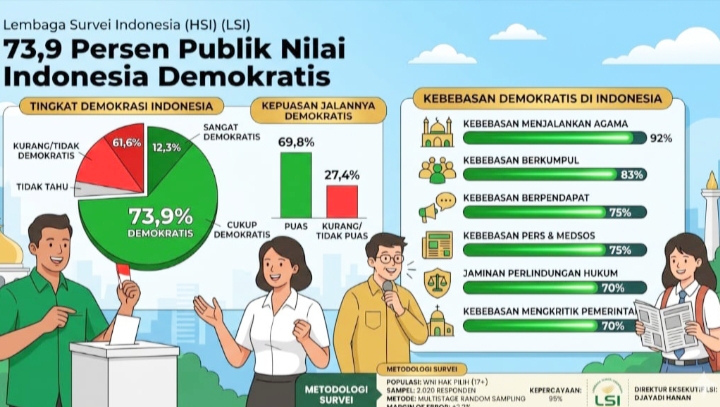 Sekilasindonews.com JAKARTA – Mayoritas masyarakat Indonesia menilai sistem politik di Tanah Air masih berada dalam koridor demokrasi. Hasil survei terbaru Lembaga Survei Indonesia (LSI) menunjukkan sebanyak 73,9 persen responden menyebut Indonesia sebagai negara demokratis.